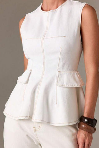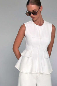Top peplum sin mangas en tono blanco marfil, elegante y versátil, ideal para realzar la silueta con un toque sofisticado. 🤍Disponible en : M
